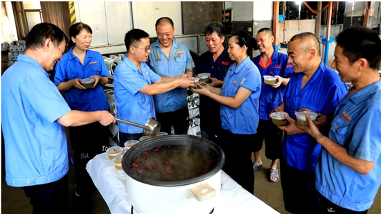 8月8日,在位于新河镇的浙江美机缝纫机有限公司车间内,企业工会人员将精心熬制的绿豆汤送到一线工人生产岗位上。