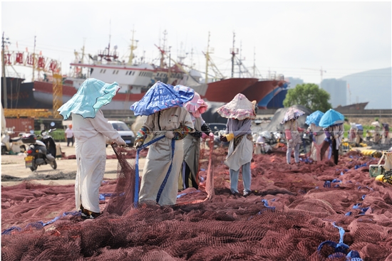 8月16日上午,在松门镇礁山港区远景居一块空地上,渔家妇女顶着烈日在修补渔网。松门镇拥有得天独厚的礁山避风良港,渔船进出频繁,带动了当地的渔网修补行业。由于补网整天在烈日下暴晒,每个人都会进行“全副武装”,包裹得严严实实,每天收入平均在200元左右。