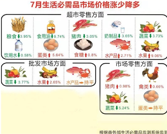 猪肉零售价持续走低。7月终端需求延续6月份的疲软状态。随着存栏生猪陆续出栏变现,终端肉类市场需求持续低迷,生猪市场供强需弱问题再现,生猪市场价格持续下降,导致养殖户抛栏情绪不断加深,掣肘了猪肉价上涨势头。预计8月猪肉价或将持续回落。7月葡萄、水蜜桃等各类应季水果刚上市,水果价格大幅上涨。后期随着气温逐渐升高,各类消暑解渴类季节性水果将迎消费热潮,水果价格整体或将小幅下降。