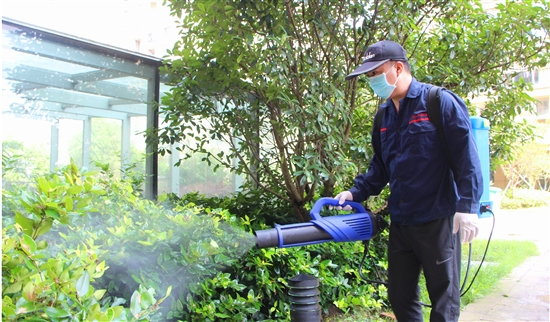 8月18日上午,在箬横镇泰和园生活小区,专业人员正在开展病媒生物消杀作业。