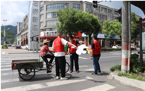 近日,石桥头镇团委、妇联组织志愿者,在振兴路红绿灯路口开展文明交通劝导活动,引导行人文明过马路,宣传和引导非机动车安全文明骑行,对闯红灯、电瓶车不佩戴头盔、路口乱停乱放等行为及时进行劝阻,并主动帮助老人安全过马路,成为一道亮丽的风景线。