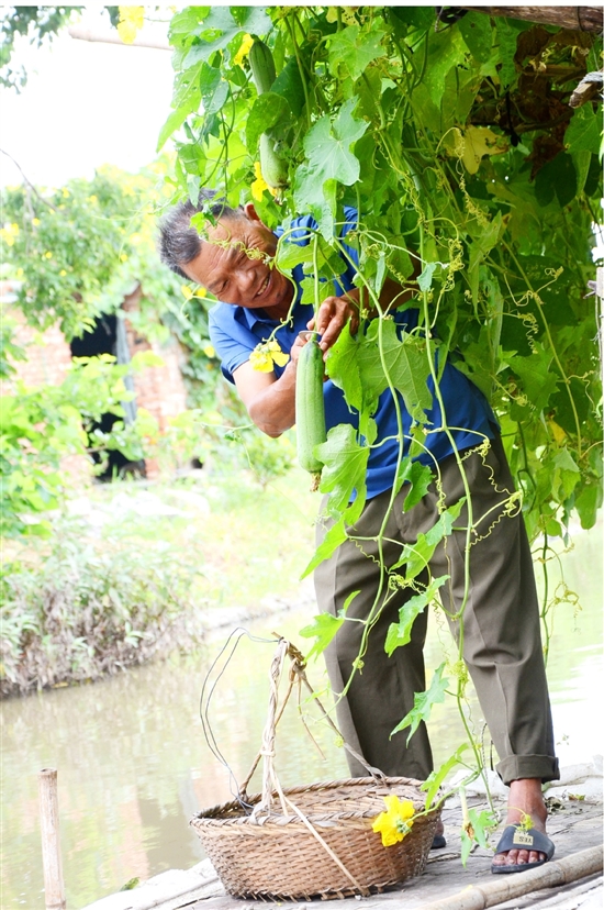 8月23日,滨海镇滨兴村村民林瑞卿撑着橡皮筏,正在采摘河岸边的丝瓜。
