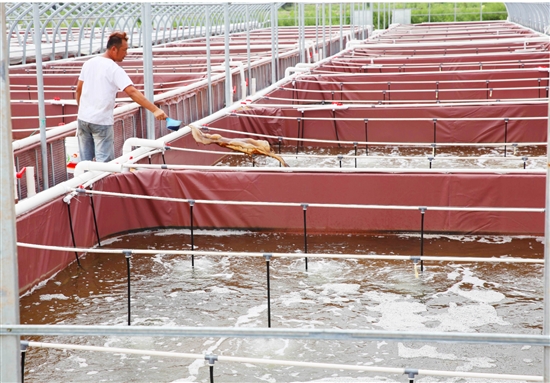 雪莉家庭农场2018年开始在台州市内率先实施大棚帆布池集约养殖南美白对虾技术,建成温室钢架大棚帆布池135只计4860平方米,配套增氧、监测、排污、沉淀净化等设施,一年放养两茬南美白对虾,取得年亩产4000公斤对虾、亩产值18万元、亩均利润8万元的良好效益,经济效益是普通土池养殖的20倍,实现大投入高产出。