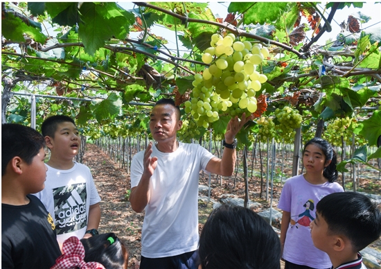 8月29日,参加东洲街道开学第一课的孩子们在何埭村的葡萄园内听种植户介绍当地的葡萄特色产业。
