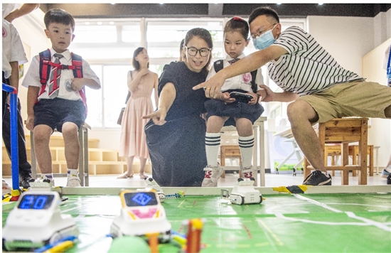 “前进、左转、右转、后退……踢球!”在龙仔科创中心,这一边,一年级的新生在学长学姐的指导下,合作玩起了编程游戏“程小奔”。另一边,新生们又被学长学姐手中的快速旋转的魔方吸引。上下左右……只用了15秒,一名六年级学姐就复原了魔方。“太厉害了!”一旁的小朋友一脸崇拜。