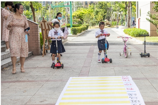 本报讯(记者江倩倩/文 朱海伟/图)“张梧峥你好,欢迎加入九龙学校,成为一名龙仔。”8月30日上午8时,九龙学校小学部一年级新生小张在爸爸的陪同下走进校园,随后领到自己的名字贴和校园地图,开始了探秘新学校的“寻宝打卡之旅”。当天,学校为一年级新生准备了“爱在九龙”入学体验活动,通过探秘校园、成长挑战、防疫学习等沉浸式、卷入式、情境式活动,让一年级小朋友初识九龙、感受九龙、喜欢九龙。
