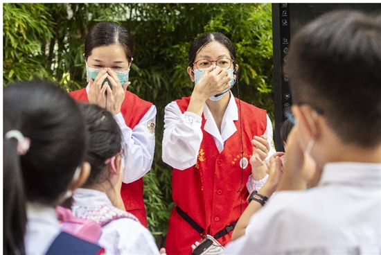 “小朋友,我们戴口罩的时候要分清楚口罩的里面、外面,上方和下方。口罩上方的金属条要贴近鼻梁,用手压压实,让口罩紧贴面部……”在龙仔乐园,市第一人民医院的医生正在给一年级新生做“防疫检测”,通过示范,教小朋友正确佩戴口罩和洗手的方法。小朋友们戴着口罩,仔细聆听,不时地调整自己所佩戴的口罩。