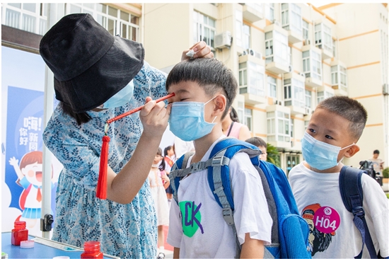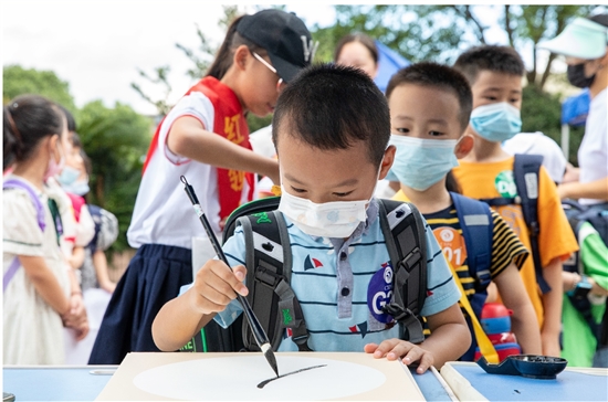 8月28日上午,城西小学为一年级新生举办了一场传统文化入学体验活动。老师们为各位同学点上朱砂,寓意“朱砂开智”;学生们在老师的指导下书写“人”字,寓意顶天立地,在人生启蒙阶段,开始学会做人,从而为人生路打下坚实基础。 记者 徐伟杰摄
