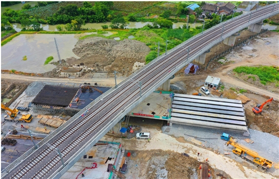 联络线成功架设 下穿杭台铁路桥梁