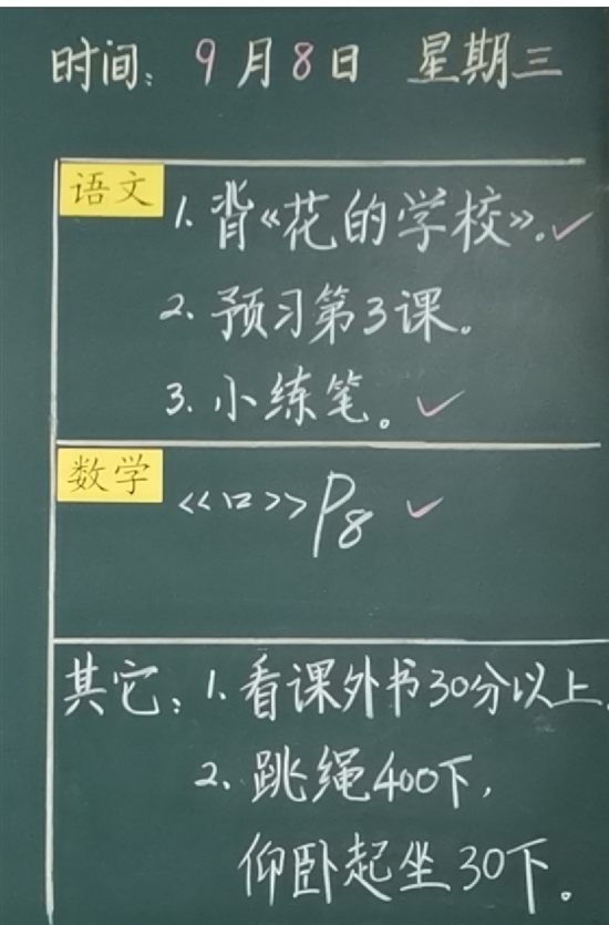 那么,学校如何管控学生的作业量呢?每天下午,各个班级的黑板上,各学科老师都会留下当天的作业明细。学校要求班主任作为班级作业量调控的责任人,依据各学科老师的作业布置情况,对作业量不正常的学科进行及时调整。“我们的要求是:一、二年级不留书面家庭作业,三至六年级学生的书面作业不超过60分钟。”学校副校长朱玲红说,“为了在源头上控制教师的作业,学校要求教研组长审核教师的作业设计,年级组长监管和协调各学科作业的数量和质量。”