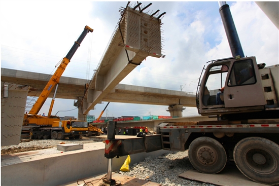 图为9月9日建设者在大溪2号桥下穿杭台高速铁路段架设左幅预制桥梁。