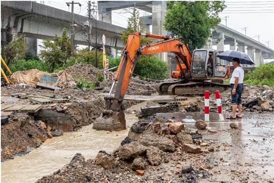 图为9月13日上午,一条长约40米的导渠已经形成,分流积水,当地积水情况明显好转。 通讯员 詹宇雯摄
