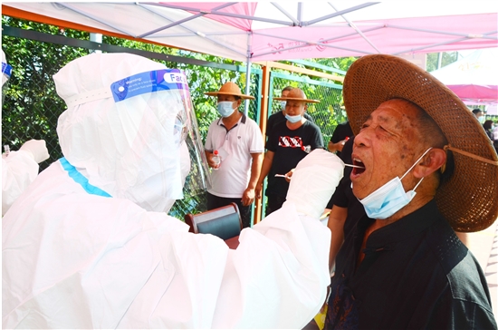 近日,在滨海镇滨兴村采样点,村民们戴着口罩,正在篮球场排队参加核酸筛查检测。