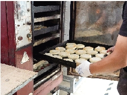 “这是五仁椒盐味的,我们下午专做这个口味,有客户订购了3000个。”跟着王秀娟,我们走进烘焙间,只见王秀娟的老公正拉出烤箱炉屉,观察一番,迅速给月饼“翻身”,神情专注。
