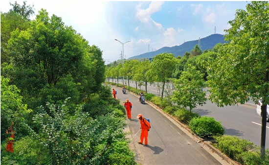 9月21日,大溪镇双塘村,市交通运输局大溪公路养护站职工在桐方线公路两侧喷洒除草剂养护公路。