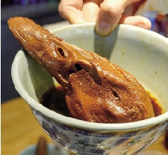 地道的吃法,得先用力吮吸一口骨头里的汤汁,顺着鸭嘴将第一口精华吸进嘴里;而后顺着脑壳儿一口咬下,连皮带肉,入口即化,肉质酥烂,嘴里满是鲜香;接着连骨头嚼烂,带着香料的辣味喷涌而出,从味蕾直冲大脑,头皮都被刺激得微微发麻,边咬边吸吮,将饱含鲜辣的汁水全盘收下;最后留下的,是最精髓的鸭脑。会吃的食客,都喜欢把这口留到最后,剥壳得小心一些,见到豆腐状嫩滑的一小块,便摇晃一番嘬入口中,小小一块滑溜入口,软嫩鲜香,非常辣却不会冲撞喉咙,这便是鸭头的全部了。