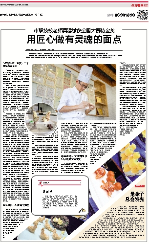 短短半个小时,两只松鼠新鲜出炉,令人爱不释手。“制作面点是一个细致活。”熟能生巧的背后是反反复复的练习。为了参加这次全国赛,从原材料的选择、产品的设计制作到最后的成型,莫建斌足足准备了一个月。只要一有时间,莫建斌就钻到实训室练习。回到家里,莫建斌又跑进厨房制作,训练后接着复习理论知识,凌晨的夜,是他这一个月来最常见的景色。“记得那段时间常做包子,刚开始女儿还比较欣喜,后来大家都吃厌了,把冰箱塞得满满当当。”高强度的训练下,莫建斌消瘦了许多,仅一个月,体重就掉了5斤。