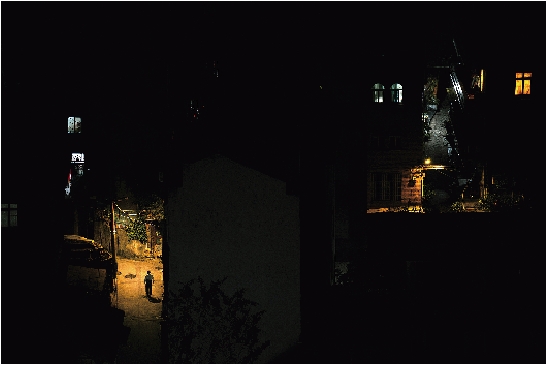 光影的巧妙运用,是这幅作品最大的亮点。摄影师采用了高角度的对称构图,利用中间的建筑将画面一分为二,画面中暖色的灯光引导观者的视线,包括画面左侧行走的路人,在交代场景信息的同时,用丰富的细节营造氛围,让人感受到老街静谧、和谐的意境。