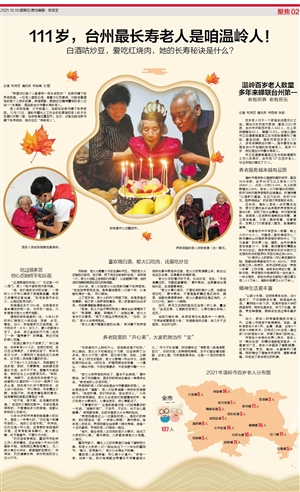 “希望你们每个人都像我一样长命百岁!”在新河镇下张养老院里,一位老人面色红润,身着大红色唐装,对前来看望她的每个人拱手致意。很难想象,眼前这位精神矍铄的老人已经111岁高龄,是目前台州市最长寿的老人。