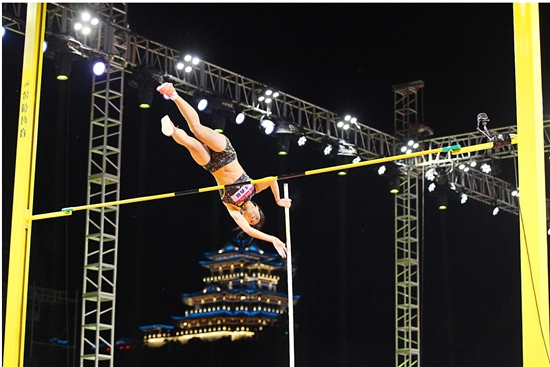 10月18日晚,中国田径街头巡回赛撑竿跳高在温岭市区东辉公园举行。