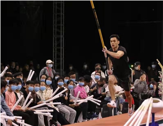 值得一提的是,当晚参赛选手中,新温岭人周顺尧的出场无疑是一大亮点。周顺尧出生于贵州,小时候跟着父母来到温岭,后就读于温岭体校,落户温岭。因为出色的体育特长,高一时,他被选入浙江田径队,跟着金涛教练学撑竿跳高。此后的时间里,周顺尧开始了与撑竿互相陪伴又互相较劲的训练生涯。