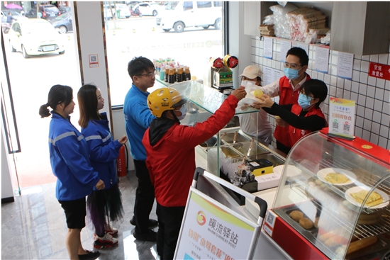 本报讯(通讯员林绍禹/文 周学军/图)“这样的‘待用包子’,让我们暖胃又暖心,感谢社会好心人的关怀。”10月25日,新河镇党委在冯源包子新河总店推出“暖流驿站”——“待用包子”特色服务,给社会上的外卖、快递小哥提供红色爱心早餐。