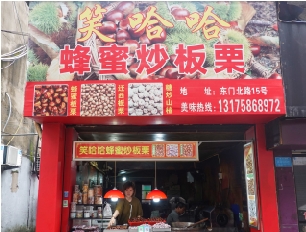 “我们每年都是9月10日开门,开到第二年6月,最多开10个月。”老板说,他家的店有13年了,自己父亲最早就守在这个街口,那时候一个小摊一把小伞,风雨无阻。谈起摆摊的那段日子,老板一脸幸福。“虽然摊小,顾客却很多。忙的时候,一天能卖出板栗五六百斤,不少来自周边乡镇的人,一来就是几十袋的栗子带回家给亲戚朋友。”