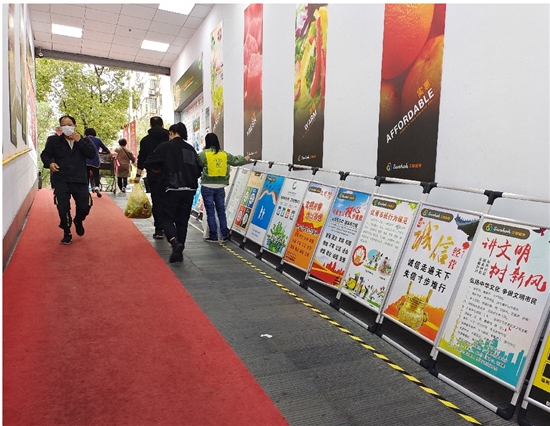 超市入口是一条长近十米的通道,通道两侧最为显眼的便是成排摆放的各类宣传架。“文明用餐,俭以养德”“诚信走遍天下,失信寸步难行”“弘扬中华文化,争做文明市民”等宣传标语相继迎客,提醒广大市民行文明事,做文明人。