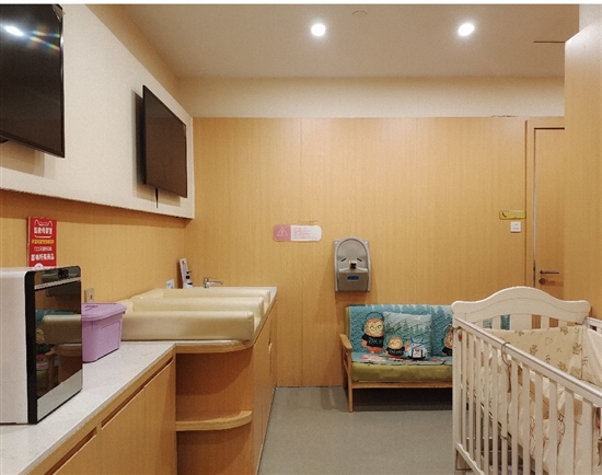 “这里很安静,孩子吃奶时也安心一些。”记者采访时,胡女士正抱着儿子坐在母婴室的沙发上喂奶。对胡女士和儿子来说,这里是整个商场中他们最熟悉的地方。“我儿子刚满月的时候,我们来过母婴室,现在孩子已经一周岁零一个月了。”胡女士说,母婴室内有尿布台和水槽,以及免费提供的尿不湿和湿巾,给孩子换尿不湿很方便;服务台上的水壶中,水温正好适合冲泡奶粉,“对带孩子的妈妈来说,这里贴心又舒适。”