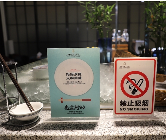 一楼的自助餐厅内,取餐台面摆放着“拒绝浪费,文明用餐”的立牌。“光盘的顾客可以领到我们的抵金券和小饼干。”餐厅服务员介绍,餐饮方面,除了提倡公筷公勺,酒店还推出小份菜和半份菜活动,减少浪费的产生。
