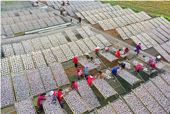 11月7日,松门鱼鲞晒场,鱼鲞加工户正在晾晒鱼鲞。