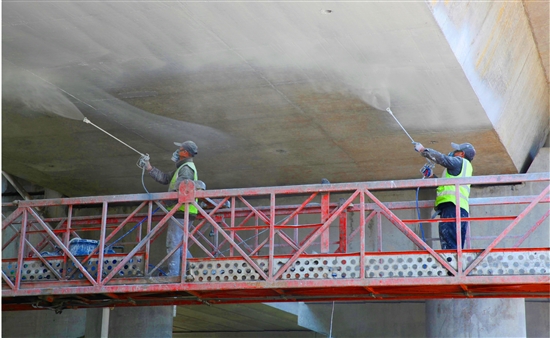 11月14日,S226泽坎线城南分离立交桥下,两位施工员正给桥底喷涂防护涂层。