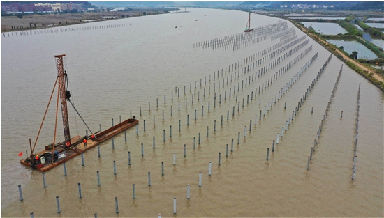 11月16日,江厦潮汐试验电站库区七一塘内,建设者正在施工潮光互补智能光伏发电场桩基。