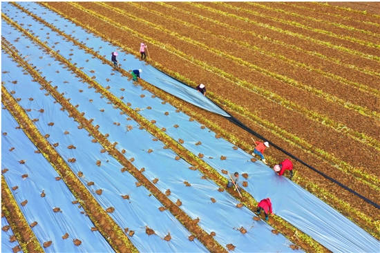 11月19日,石桥头镇东浦新塘蔬菜基地,蔬菜大户在覆盖地膜,准备种植花椰菜。