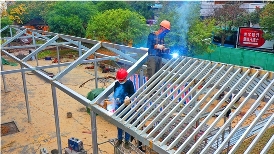 11月19日,文沁公园改造现场,施工人员在焊接廊架。