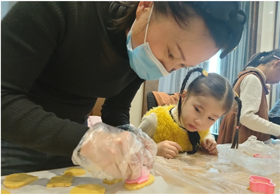 当天,30多名孩子和妈妈一起,在志愿者的指导下动手制作饼干。妈妈们负责揉面、打蛋、分工具,孩子们负责选择自己喜欢的图案。分到面团后,他们一起擀面、压形状,把作品放进烤箱。出炉后,大家吃着自己亲手制作的饼干,心里美滋滋的。