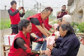 温岭市朝阳志愿队为九旬老人送上母亲节礼包。