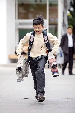 20米折返跑处,家长们背着空呼器,提着水袋风驰电掣,小朋友们在一旁呐喊助威,吸引了不少人的目光。第一次见到这些玩意,五年级的林鑫磊按捺不住好奇心,自告奋勇,提出替妈妈参与。来回跑了一圈的他切身感受着装备带来的重量,也体会到消防指战员们灭火时的艰辛与不易。“仿佛身上背了好几个沙袋,行动起来极为不便。”