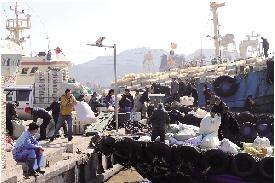 11月23日上午,松门镇礁山码头人头攒动,渔民们带着生活物资,准备出海生产。