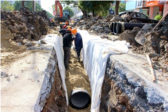 近日,在箬横镇横滨大道自来水提升改造水岸居标段项目施工现场,工人们正在紧张地开展500口径管道的铺设作业。相关负责人表示,作为一项重要的民生实事举措,该项目预估投资370多万元,涉及管道路径2公里左右,其中500口径管道占50%以上,投入使用后,将大大改善该镇建成区西侧近1.5万人的居民饮用水保供条件。