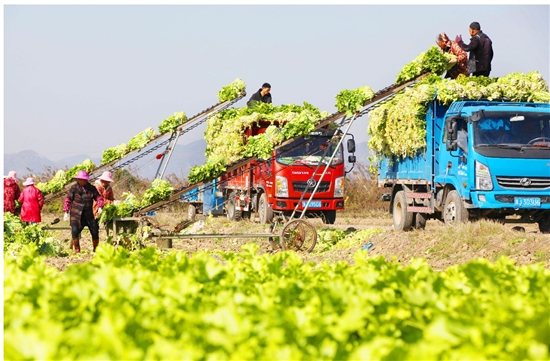 12月2日,东浦新塘,箬横镇种菜大户正组织民工采收装车运送叶用芥菜下梁菜。