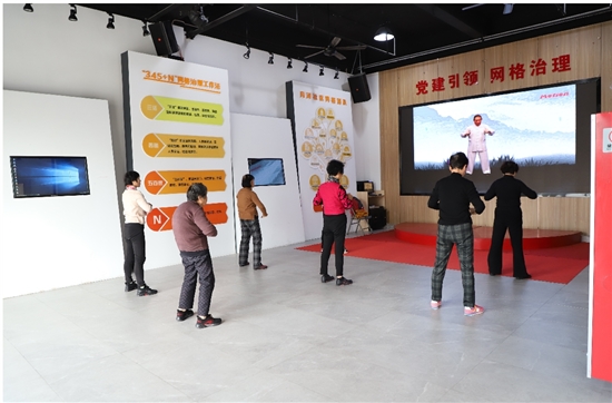 每天上午8时30分,月河社区党群服务中心一楼大厅内,周边不少居民会准时过来,跟着大屏幕上的教学视频练习八段锦,强身健体。