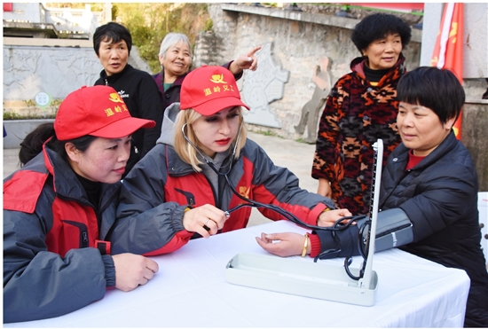 近日,在城南镇南山公园开展的志愿服务集市活动中,来自白俄罗斯的“洋义工”娜塔莎,正为现场群众测量血压。