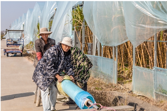 “开展大棚甘蔗覆膜作业,主要是为了抵御寒潮,给大棚甘蔗创造有利的生长环境,同时也有助于对棚内的温、湿、水、肥等进行更加有效的科学化管理,这些都是实现精准化种植的重要部分。”负责人陈建国现场向记者介绍道,当地大棚甘蔗预计在明年2月份春节前后上市,而反季节上市的甘蔗预期能带来不小的收益。