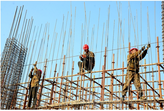 12月7日,在市粮食储备中心建设工程滨海粮食储备库施工现场,施工人员正在绑扎梁柱(墙)钢筋。