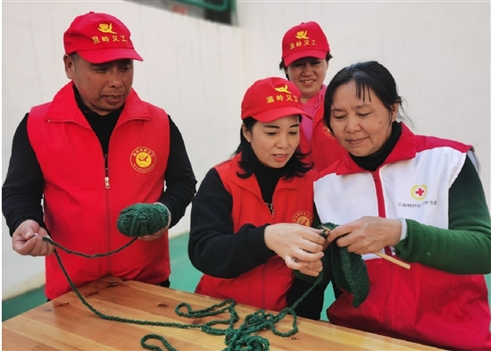 “起头的时候,一针正、一针反,织围巾最好起50多针……”赵晓斐阿姨和松门义工队的义工们现场教景宁的志愿者编织围巾。