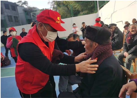 “这条围巾真好看,戴上它真暖和。感谢你们大老远过来给我们送温暖。”今年88岁的吴汉余老人是一名老党员,他握着志愿者的手感动地说,“温岭景宁一家亲,希望你们以后常来看我们。”