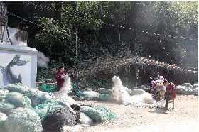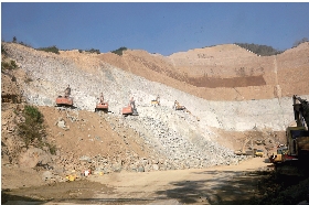 从村口进去不远,就听到马路北边的一处矿区传来“铿铿铿”的敲击声,走近,从路边牌上得知,这里是中瓯生态工程集团有限公司施工的温岭市城南镇岭头废弃矿山生态(地质)环境治理工程。工地上,有五六台炮头机正在施工,运输车则从矿区驶进驶出,将石料运往担屿涂的工地上。