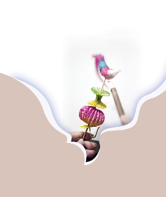“叫头”分成三个部分:哨子、小红球和小公鸡。这三个部分从下到上地扎在一根竹签上, 只要调整好哨子的方向,吹一下,不仅可以听到哨声,中间的小红球也会随着气流滴溜溜地转!