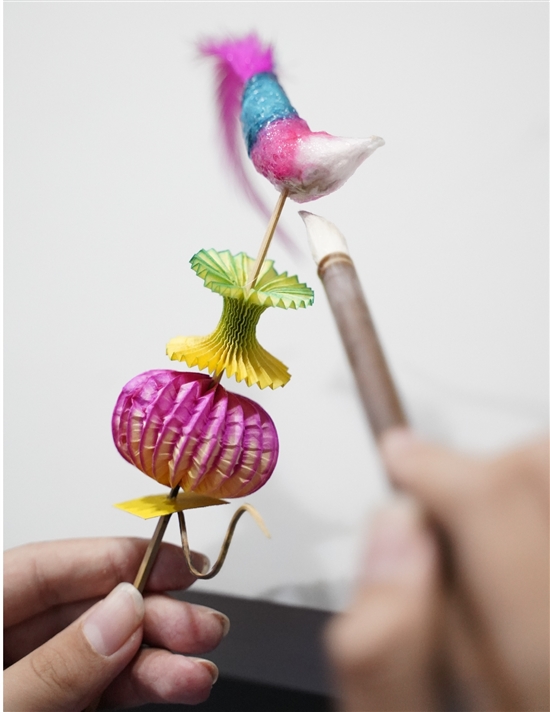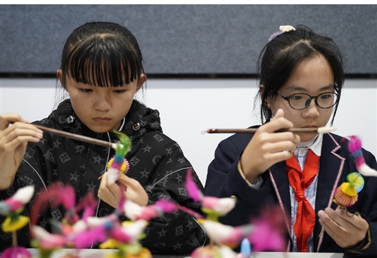 放置小垫片、制作小红球、给“小鸟”刷上糨糊、插上竹哨……学生们在顾师傅的指导下一步步完成制作,半个多小时后,一支色彩艳丽,造型别致的“叫头”就在学生手中“绽放”,快乐的哨声在听涛居回荡。